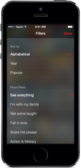 Filter your movies and show with our “emotional genres”. Optionally you can sort that filtering by different options to accommodate your needs.